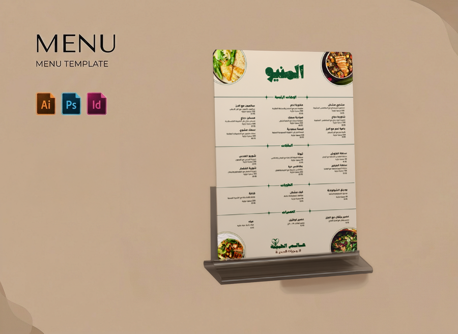 تصميم منيو احترافي للمطاعم والمقاهي، مناسب للطباعة أو العرض الرقمي أو QR، بتنظيم واضح وإخراج بصري أنيق.